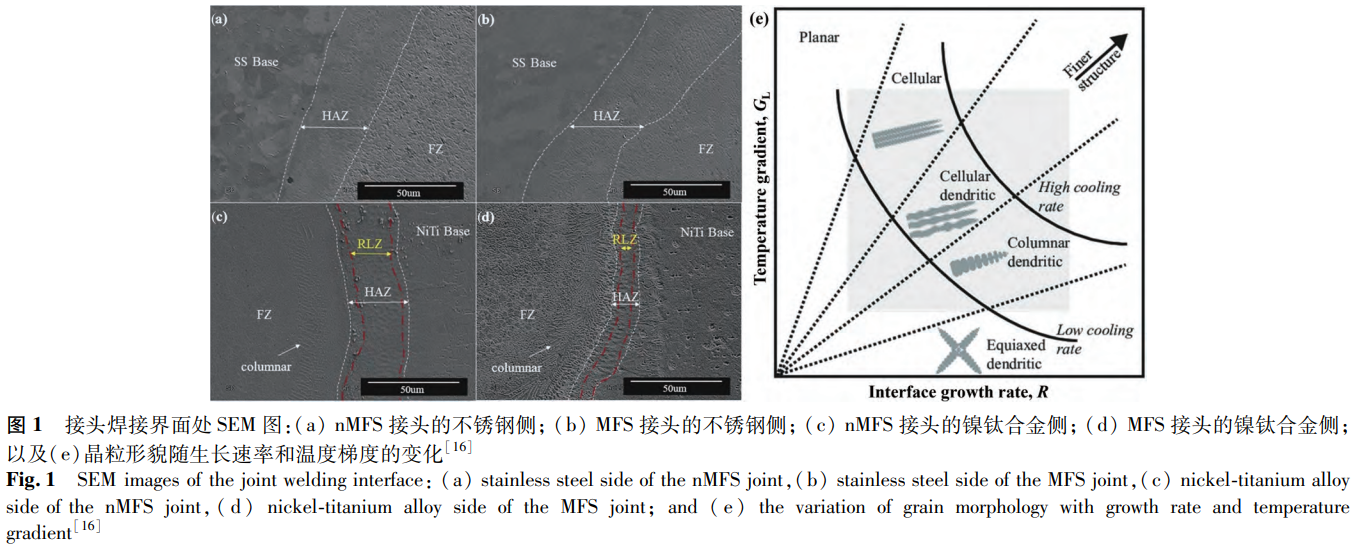 Farhang等使用激光焊連接鎳鈦合金與不銹鋼,探究了外磁場對焊接接頭的影響。其中,無外磁場輔助的焊接記為nMFS,外磁場輔助的焊接記為MFS兩種接頭焊縫界面處的SEM圖如圖1所示。從圖1中可以觀察到,在這兩種接頭中均出現從熔合區中心向熱影響區的晶體形態轉變的現象。在nMFS接頭中,從熔合區中心至不銹鋼側,晶體形態呈現出由等軸晶粒向柱狀晶再到平面晶的轉變;而從熔合區中心至鎳鈦合金側,晶體形態的變化則為等軸晶粒、柱狀晶直至胞狀晶,且其中柱狀晶粒的取向與冷卻方向相互平行。該研究表明,這些相變行為與界面處的溫度梯度和生長速率有關,圖1e對凝固過程進行了歸納。具體來說,在熔合區中心,G值較低,R值較高,促使枝晶生長形成等軸晶。在從熔合區中心向基材移動的過程中,G值和R值改變,形成柱狀、胞狀/平面結構。磁場對電子運動的影響改變了電子在凝固和生長過程中所攜帶的能量。因此,在MFS接頭中觀察到不同于nMFS接頭的凝固現象。相較于nMFS接頭,MFS接頭中熔合區中心形成較細的等軸晶粒(如圖1a、b所示),這是由于磁場降低G值的同時增加了R值。且熔融材料受到洛倫茲力的影響發生旋轉,使原本平行于冷卻方向的柱狀晶粒(位于從熔合區向鎳鈦合金轉變處)取向改變,呈隨機取向(見圖1d)。此外,磁場使電子運動偏移造成的熱輸入減少以及磁場促進熔體運動引起的冷卻速率加快共同導致MFS接頭的反應層區更窄。
