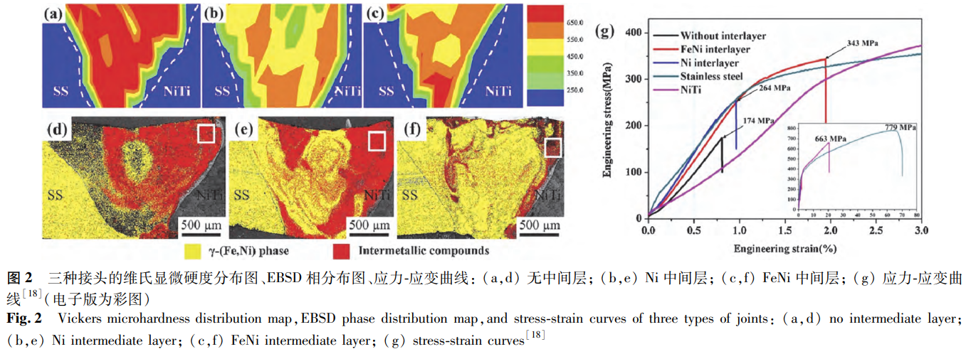 Niu等針對通過真空電子束焊接形成的三種NiTi/SS接頭開展了對比評價,這三種接頭分別為電子束偏移到SS側且無中間層的接頭、添加Ni中間層的接頭以及添加FeNi中間層的接頭。各接頭的硬度分布情況如圖2a-c所示,由圖2a-c可知,焊縫區的硬度顯著高于兩種母材。這一現象的成因在于焊縫區中存在金屬間化合物以及發生了固溶強化作用。通過對比硬度圖與相分布(見圖2d-f)發現,接頭中的金屬間化合物含量越多,其硬度越高。為進一步探究對其力學性能的影響,Niu等對焊接樣品進行了拉伸測試,結果表明FeNi中間層接頭展現出最優的拉伸性能,Ni中間層接頭次之,而無中間層接頭的拉伸性能最差(見圖2g)。進一步觀察發現,三種樣品的斷裂位置均處于焊縫區內靠近鎳鈦合金一側。借助掃描電子顯微鏡(SEM)和電子背散射衍射(EBSD)技術對裂紋分析可知,在無中間層接頭中,金屬間化合物以Fe2Ti作為主相,Ni3Ti則呈連續網狀分布于其中。裂紋徑直穿過金屬間化合物進行擴展,當遇到較厚的Ni3Ti相時,會出現輕微的偏轉現象。由此可見,該斷裂接頭呈現出解理斷裂的特征。在Ni中間層接頭里,金屬間化合物以Ni3Ti為主相,Fe2Ti呈網狀分布于其中。裂紋的擴展僅僅在Fe2Ti相中發生,并且會被Ni3Ti相阻擋。因此,該接頭斷口表現出沿晶斷裂的特征。對于FeNi中間層接頭而言,Fe2Ti以柱狀枝晶的形態析出,Ni3Ti分布在其枝晶之間。裂紋主要出現在Fe2Ti枝晶內部,不過會被枝晶間的Ni3Ti相阻斷。這種復合結構能夠有效地阻止裂紋的進一步擴展,使得斷裂接頭同時具備解理和韌性斷裂的特征。