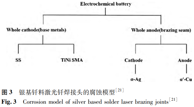Li等選用銀基合金作為填充金屬,獲得激光釬焊NiTi/SS接頭,探究了兩種母材、填充金屬以及焊接接頭在不同pH值的人工唾液中的腐蝕行為。他們發現接頭的腐蝕主要發生在釬焊縫以及填充金屬與兩種母材的界面處,這是因為釬焊縫的電極電位低于鎳鈦合金與不銹鋼,在人工唾液中成為原電池的陽極首先被腐蝕(見圖3)。接頭的耐腐蝕性與鎳鈦合金母材相近,優于填充金屬,但低于不銹鋼母材。另一方面,人工唾液的pH值會對材料的耐腐蝕性造成影響,pH值越高,材料的腐蝕電位越高,電流密度越低,耐腐蝕性越好。