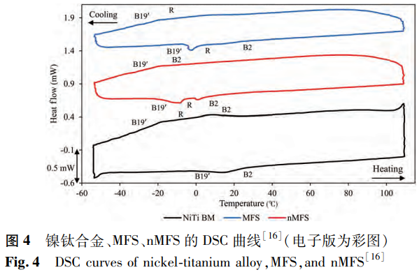 鎳鈦合金的形狀記憶效應源于馬氏體相變,這是該合金的一項關鍵性能。激光焊接會致使合金的顯微組織發生改變,進而對馬氏體相變以及逆相變過程產生作用,使得焊接接頭的形狀記憶效應有別于鎳鈦合金母材,這一點在已有研究中有所提及。鑒于此,針對焊接接頭形狀記憶效應開展研究極為必要,因為形狀記憶合金的相變特性是評估其功能特性的重要依據之一。Farhang等運用差示掃描量熱法對鎳鈦合金以及存在或不存在磁場的NiTi/SS接頭進行了測試,測試結果如圖4所示。其中,奧氏體(B2)、馬氏體(B19’)以及R相通過圖中的峰位得以確定,而奧氏體終止溫度Ai則被用作比較不同樣品之間轉變溫度的指標。經測試,鎳鈦合金的奧氏體終止溫度為24.7℃,與之相比,nMFS樣品的奧氏體終止溫度降低了約20℃,這表明nMFS樣品的功能特性發生了明顯改變。導致nMFS樣品轉變溫度降低的因素是多方面的,包括其內部存在較多的缺陷、焊接過程中冷加工性能的消除、殘余應力和晶粒生長現象的出現以及Ni/Ti比的上升等。然而,MFS樣品的奧氏體終止溫度為24.1℃,基本保持了鎳鈦合金基材的轉變溫度水平,這意味著鎳鈦合金的功能特性在MFS樣品中得到了有效的保留。