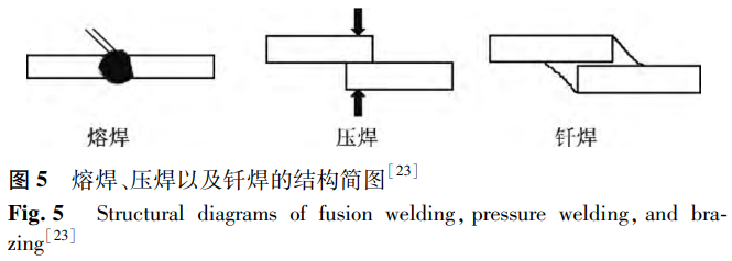 依據焊接過程所呈現出的特性,焊接可被劃分為三大類別,即熔焊、壓焊與釬焊,其相應的結構簡圖如圖5所示。熔焊是指在無壓力的情況下對母材進行加熱,使其熔化并相互混合,在冷卻后形成焊縫。氬弧焊、電子束焊、激光焊等均屬于熔焊。壓焊在焊接過程中必須對母材施加壓力,但對加熱沒有要求。它是一種使材料在固態下實現原子間結合而實現連接的焊接方法。壓焊可分為多種類型,如電阻焊、摩擦焊、超聲波焊等。釬焊是指通過加熱使焊材之間的填充金屬熔化,液態釬料與固態焊材相互擴散,冷凝后形成接頭的方法。目前,針對鎳鈦合金與不銹鋼的焊接研究多聚焦于激光焊接領域。主要得益于激光焊接具備熱輸入量低、能量密度高以及熔合區與熱影響區范圍小等顯著優勢。