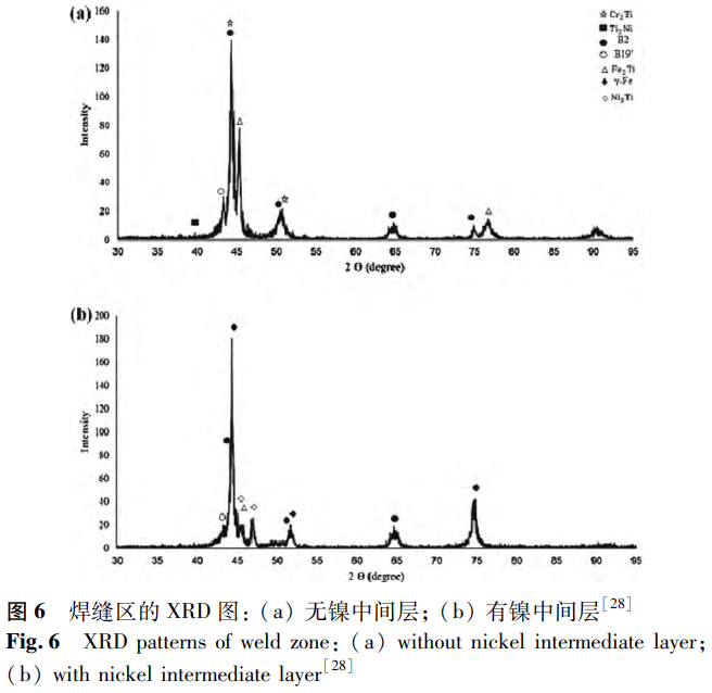 此外,添加中間層也是控制Fe-Ti等金屬間化合物形成的有效方法,能夠改善接頭性能。例如,在直接焊接的TC4/SS接頭中會產生大量Fe-Ti等金屬間化合物。Liu等采用復合中間層制備TC4/SS接頭,發現能夠防止Fe-Ti脆性相的產生,可以在很大程度上優化接頭的力學性能,具有重要的研究價值。在鎳鈦合金與不銹鋼異種焊接方面,Asadi等研究了鎳中間層對激光焊接接頭的影響。通過x射線衍射(XRD)分析可知(見圖6),添加鎳粉后焊縫的Fe2Ti初生相轉變為Ni3Ti初生相,γ相和Ni3Ti相含量增加,脆性金屬間化合物含量減少。這是因為焊縫中過量的鎳會造成Ti、Fe和Cr的減少,并且鎳是奧氏體形成元素和γ相穩定劑,促進了γ-Fe的形成。Li等深入研究了鎳中間層厚度對焊接接頭產生的影響。研究表明,隨著鎳層厚度逐步遞增,接頭內的鎳含量相應上升,脆性金屬間化合物減少,進而使得接頭性能得以提升。當鎳中間層的厚度增長至50μm時,接頭的抗拉強度以及斷裂伸長率達到最大值,分別為372MPa和4.4%。然而,倘若鎳中間層厚度繼續增加,接頭內部會形成更多的Ni3Ti相,同時會產生氣孔與縮孔等缺陷,最終致使接頭性能下降。這一研究結果與周海寬等等得出的結論相互吻合、保持一致。因此,為獲得性能優異的焊接接頭,需要選擇合適的中間層厚度,即焊縫成分。此后,Li等研究了銅中間層、鈷中間層、38Zn-61Cu中間層對NiTi/SS接頭的影響,并在38Zn-61Cu中間層的研究中增加激光偏移技術,在接頭處形成三個區域,即SS側熔合區、未熔化SS以及NiTi/38Zn-61Cu/SS形成的擴散焊縫。在這些研究中觀察到類似的現象,即通過抑制脆性金屬間化合物的形成來改善接頭的力學性能。同時,銅中間層的使用還可以消除熱應力產生的裂紋,但銅中間層過厚會形成富銅球,其與周圍基體的結合相對較弱,有利于裂紋形核和擴展。