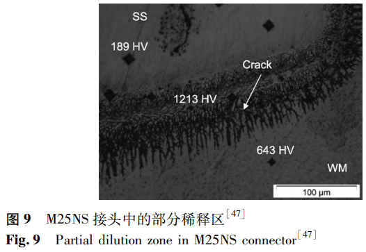 除了選擇合適的焊接工藝參數外,還可以通過加入中間層的方法來改善焊接質量。Oliveira等以鎳鈦合金和Inconel625為填充材料,探究了不同填料以及熱處理對氬弧焊焊接接頭的影響。在接頭中觀察到通過外延凝固形成的枝晶,枝晶的生長導致枝晶間空隙中存在溶質排斥,并可能形成金屬間化合物,因此,裂紋主要沿著枝晶間區域形成。無序晶格減緩了位錯的遷移率和原子擴散過程,導致結構中內應力的形成,提升了其硬度和脆性。相比于鎳鈦合金填料,使用Inconel625填料的接頭通常具有較高的抗拉強度,最佳可達到286MPa。對于未經焊后熱處理的樣品,在焊縫和母材之間的熔合線處形成了清晰界面區域,即部分稀釋區(見圖9),該區域會析出金屬間化合物。在進行熱處理之后,焊接接頭中不存在部分稀釋區。且焊后熱處理減小了接頭中的殘余應力,使接頭具有更高的力學性能。