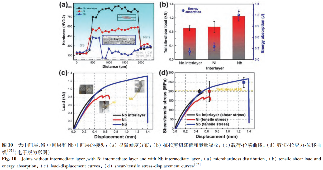 通過替換有害相和限制混合這兩種方法可以控制焊接接頭中的金屬間化合物。為此,Zhang等選擇了低熔點Ni和高熔點Nb作為中間層。在Ni中間層接頭中,隨著脆性Fe2Ti相的替換,以Ni3Ti為主的焊縫具有更好的延展性。但鎳的蒸發會導致大氣孔、縮孔、裂紋的產生,使有效連接面積減小,造成接頭強度降低。在Nb中間層接頭中,熔合區被未熔融的Nb分離,這抑制了不同熔融金屬間的混合,并在界面處形成低脆性的含鈮共晶結構。該接頭強度在斷裂載荷方面提高了38%,在能量吸收方面顯著提高了460%,如圖10所示。由此可知,高熔點中間層具有實現可靠NiTi/SS電阻點焊接頭的巨大潛力。