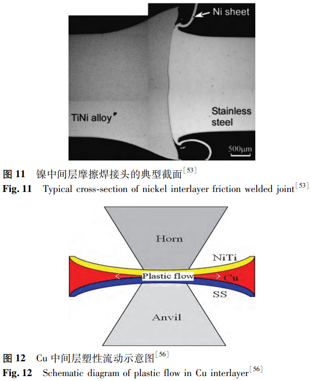 在超聲波焊接過程中,材料不會熔化,這抑制了過渡相的形成,適合異種金屬的焊接。其核心是超聲振動,高頻超聲振動有助于促進焊接時材料的聲軟化。在實際等效軟化效果的條件下,熱軟化所需的熱能輸入是超聲能量的107倍。Chen等發現未添加中間層的NiTi/SS超聲波點焊接頭具有機械互鎖結構,抗拉強度可達到404.71N。Ao等制備了具有Cu中間層的NiTi/SS超聲波點焊接頭,并研究了不同焊接能量輸入對接頭的影響。研究發現,焊接時的接觸壓力不均勻導致Cu中間層發生塑性流動(見圖12),使接頭的焊接界面呈現出NiTi/Cu/304SS界面和NiTi/304SS界面兩種類型。在不同能量輸入下,異種接頭的兩個界面處均未發現金屬間化合物。在性能方面,平均拉伸剪切載荷先增后減,在750J時達到690N的最大值。這是因為隨著能量輸入的增大,熱輸入增加,材料軟化,銅中間層塑性變形,使得結合區擴展到整個界面,接頭性能顯著提升。當能量輸入過大時,由于銅中間層的斷裂,鎳鈦合金與不銹鋼直接接觸,接頭性能降低。Chen等使用Al中間層進行了相似的研究,鋁中間層的塑性流動也產生了雙界面。不同的是,焊接能量較高時,界面處會形成Fe4Al13脆性相。當焊接能量適中、界面機械聯鎖程度高、元素擴散距離長、不存在連續脆性相時,接頭性能最佳。