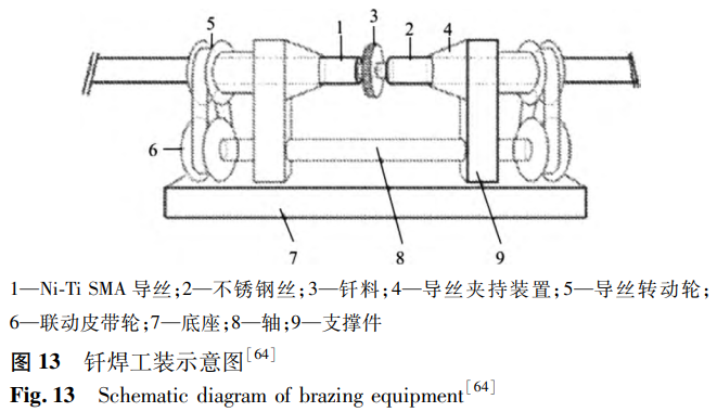 閻開婷等公開了一種血管內鎳鈦合金導絲、導絲焊接工裝及導絲焊接方法。焊接工裝如圖13所示,在氬氣保護氣氛下,利用夾具連續轉動線材進行激光小光斑多點環繞加熱,使釬料熔化包覆在階梯狀端頭上,完成鎳鈦合金與不銹鋼的端部連接。