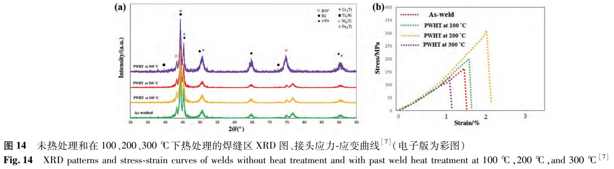 Asadi等研究了焊后退火溫度對激光焊接NiTi/SS接頭的影響。SEM結果顯示,經過100℃和200℃的退火后,接頭的顯微組織沒有明顯變化。而在300℃退火的接頭中觀察到較大的枝晶結構。相組成方面,相較于無焊后退火處理的接頭,100℃和200℃的退火處理對物相無明顯影響,但300℃的熱處理會導致金屬間化合物增加(見圖14a)。因此,焊接接頭的硬度和拉伸性能均隨退火溫度的升高而改善,但退火溫度達到300℃時力學性能惡化。如圖14b所示,200℃接頭具有最高的抗拉強度,其值高達310MPa,是未熱處理接頭抗拉強度的1.91倍。而300℃接頭的抗拉強度僅為129MPa,低于未熱處理接頭。類似的研究也呈現出相同的結果,經過200℃焊后熱處理的樣品的抗拉強度由213MPa提高到393MPa,耐腐蝕性能也得到提高。
