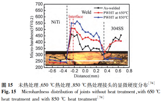 Chen等研究了焊后退火工藝對以鎳為中間層的NiTi/SS接頭的影響。研究表明,未熱處理接頭的NiTi/Ni界面可分為兩層,隨著焊后熱處理溫度的升高,NiTi/Ni界面和焊縫處析出越來越多的Ni3Ti金屬間化合物,在850°C接頭的NiTi/Ni界面中已全部轉變為Ni3Ti相。這使得所有接頭的硬度在NiTi/Ni界面達到最大,且焊接區硬度隨著退火溫度的升高而提高,如圖15所示。由于焊后熱處理使接頭組織逐漸趨于均勻化,焊縫的最大硬度與平均硬度之間差值減小,接頭的抗拉強度提高,在850℃接頭中達到643MPa的最大值,是未熱處理接頭抗拉強度的2.12倍。因此,焊后熱處理可以改善焊接接頭的性能,但為了達到預期效果,需要選擇合適的熱處理工藝。